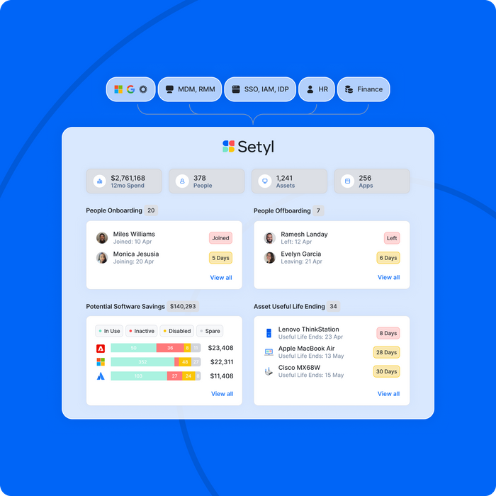 Setyl is a cloud-based IT Asset Management (ITAM) Platform, which connects to your existing tech stack with more than 100 out-of-the-box integrations.
