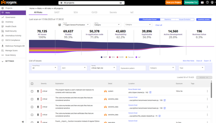 By combining SAST, SCA, IaC security, CI/CD protection, and malware detection into a single platform, Xygeni gives security and DevSecOps teams full visibility across the SDLC. Its AI-driven prioritization and automated remediation help teams focus on the risks that matter most and fix them quickly, without slowing developers down.